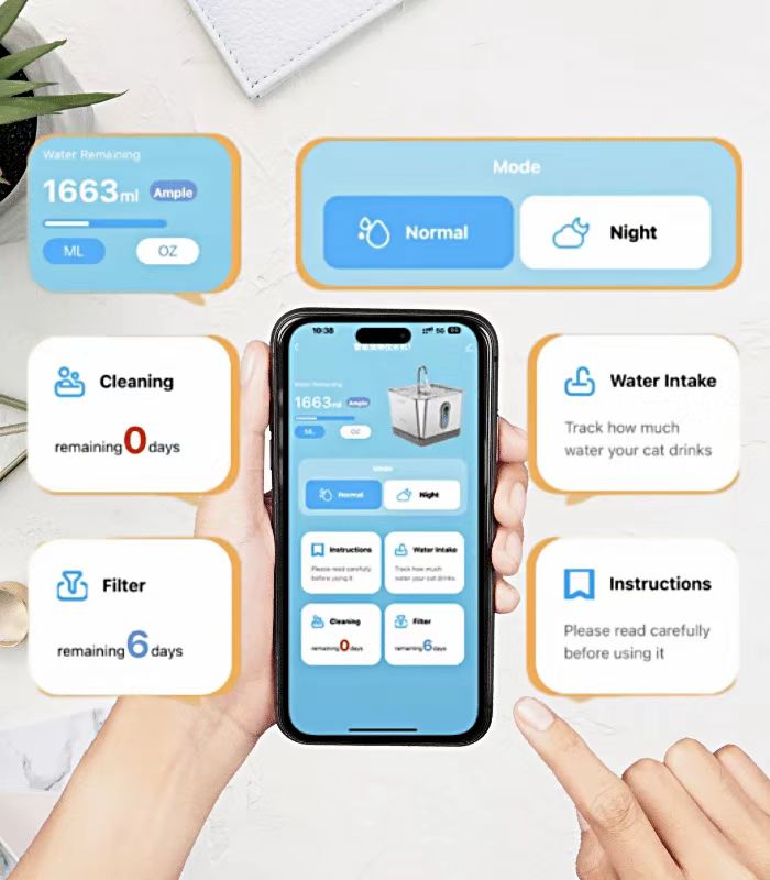 After APP connection, you can remotely monitor your pet's daily drinking status and the accurate value of remaining water anytime and anywhere via your mobile phone.
